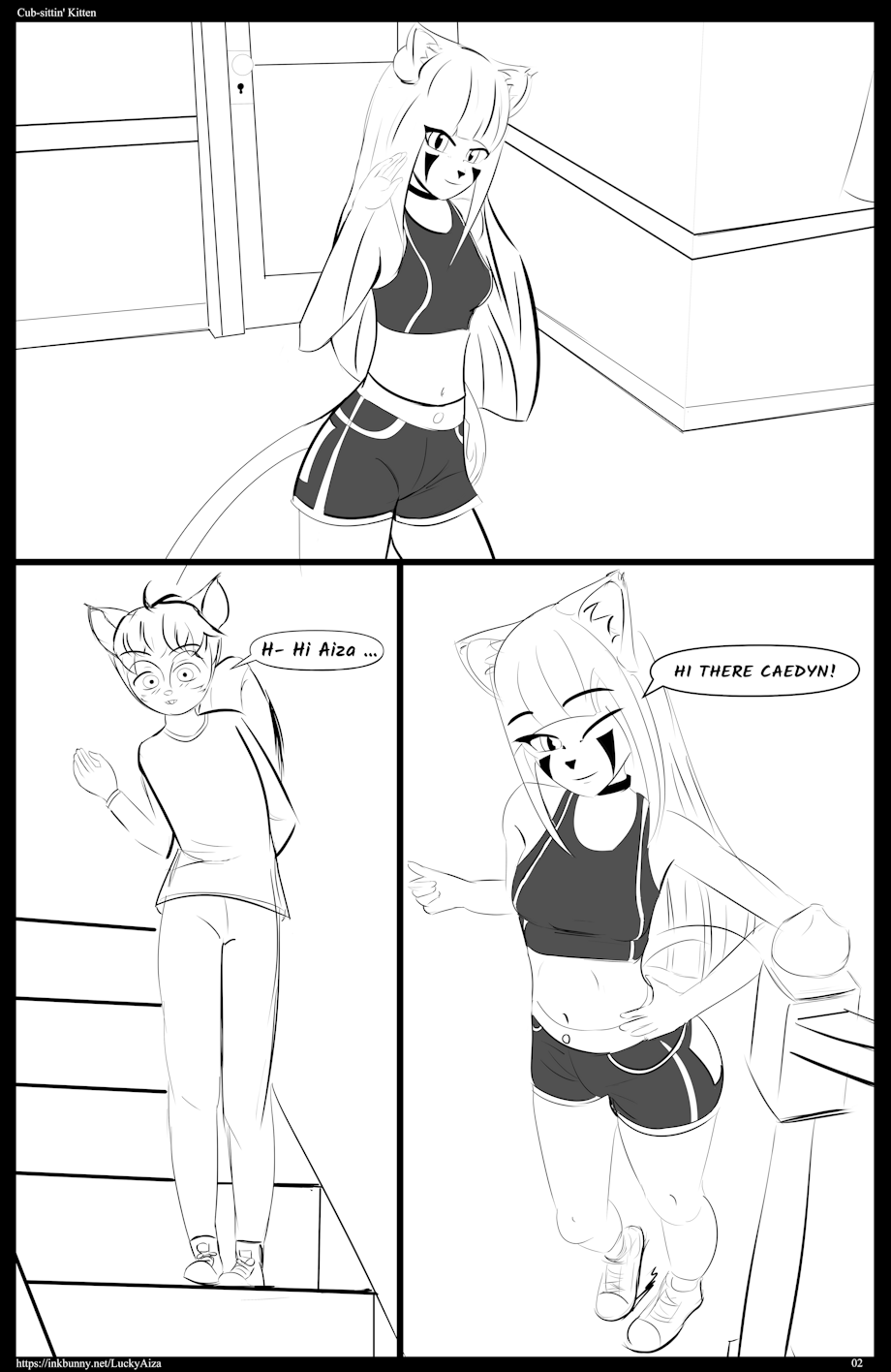 Starting to head down the stairs, he notices the white-furred blonde still wearing some sort of short-cut sports outfit from school. From the shape of her ears and tail, he quickly concluded she was either a cat or a closely-related member of the feline races. A little more fur showing than he expected too, even for a young sitter!