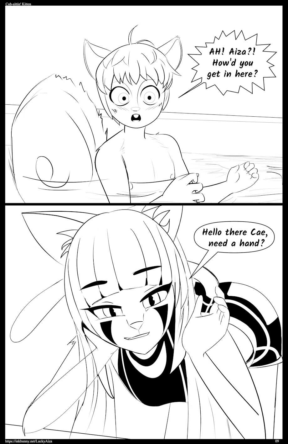 Just about as fast as Caedyn could turn his head to the door, Aiza with her soft feline stride had already reached the side of the tub. Felines are masters of sneaking up!