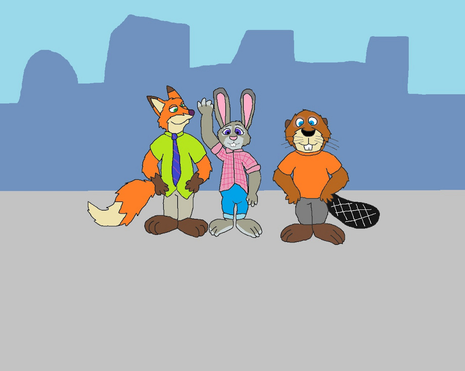So here is Nick Wilde, Judy Hoops and Guy Beaver (my Fursona in Zootopia) standing infront of a skyline.