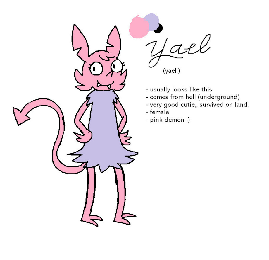 I thought she looked nicer last time, but here I am draqing her again. She is a pink demon from hell, and is a very good cutie. She was actually one of my older characters before she developed into something.. different. I did make a series for her but never produced it.. yet. She *does* have a brother and her mother, though she hadn't even been explored THAT much as far as I know... she lives outside Hell and apparently hangs out with Mittens + some other townfolk not from her area.