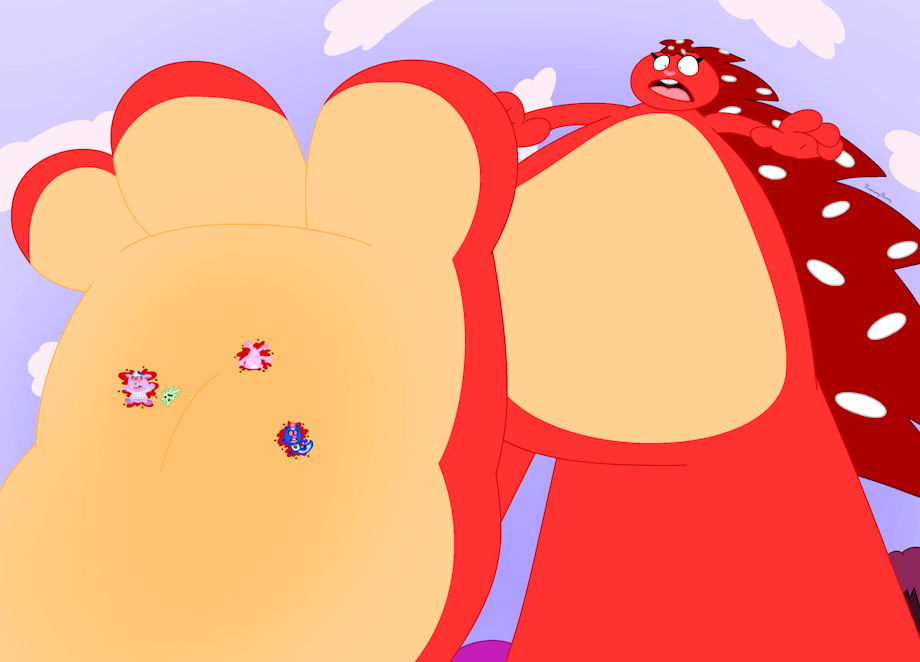 Flaky somehow grew to massive proportions (likely due to an accident at a nearby power plant) and accidentally crushed the other girls to death. She didn't mean to squish them, honest! It's not like they'll hear her booming voice anyways since they're dead. /: