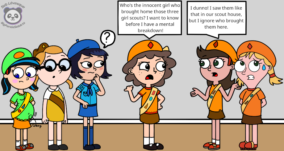 Here's a drawing of which Milly asked at Adyson who brought these three new girls in their scout house.