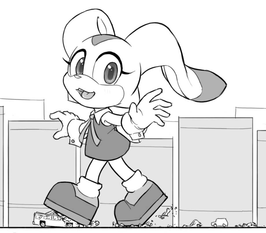 Awww, Cream looks adorable here! Neat to see more on-model Sonic art from you! Her waving over at the camera innocently as her huge shoes stomp out everything on the road is too cute. Big floopy ears too! Love the effect the exaggerated proportions have on the crunchy stomps. Cute start to the stream!