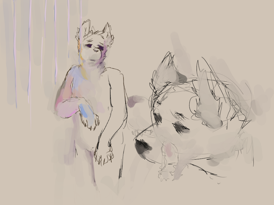 [two paintings of an anthropomorphic canine, one standing and looking aimlessly, the other a headshot. overtop of the portrait is a second painting of the anthro with his mouth open.]