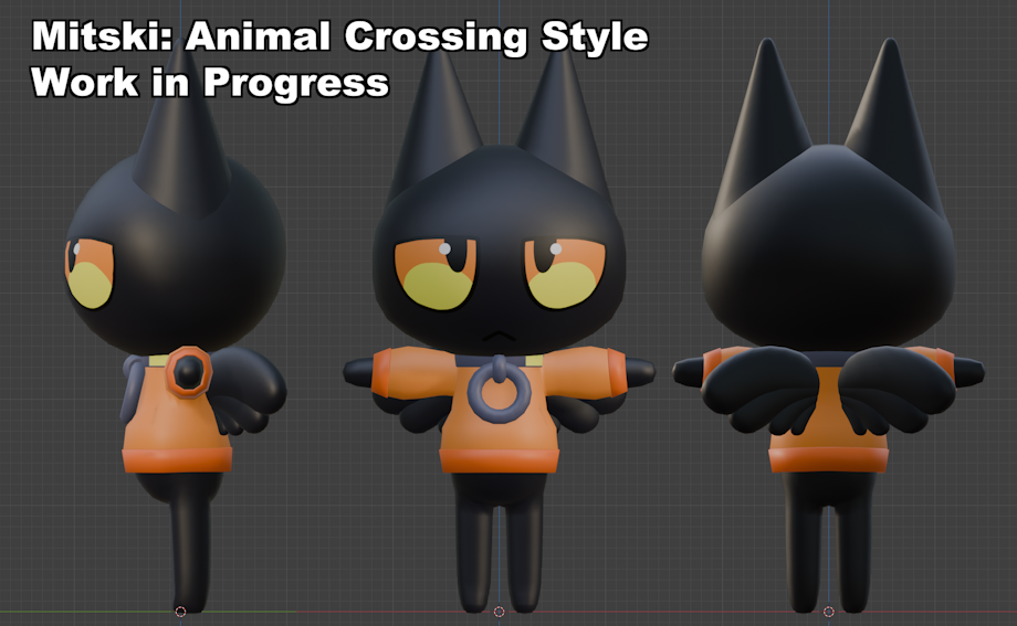 I'm working on a little animal crossing villager style model for my character Mitski :D I'm really proud of this. Just, uh... Don't... Don't look at the polygons at the top of the ears, we don't talk about those