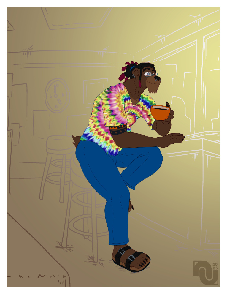 Gabriel sits in the cafe, enjoying his cup of coffee while people-watching.