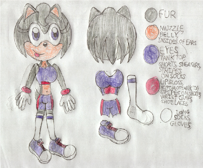 I decided to whip up an updated ref sheet for my OC Susan the Hedgehog. As you can see, I changed her outfit to a red and purple tank top and shorts, changed her lip gloss to red, and changed her shoes to purple sneakers with white soles and toes and red laces.