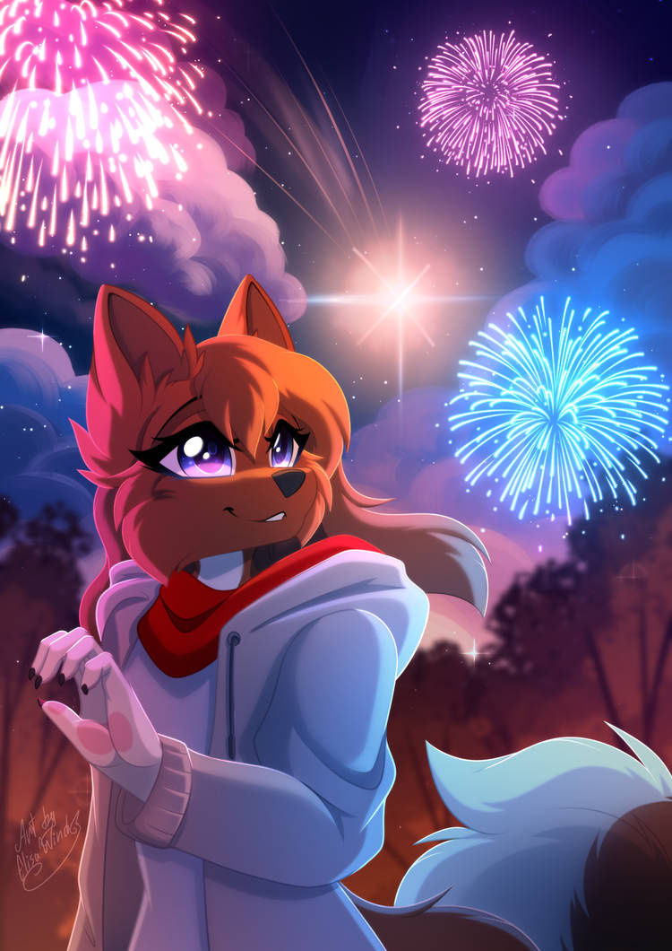 This year Sara wanted to admire fireworks outside her home. Sara puts on her favourite outfit and comes out. She heads to the close park. When entered the park she heard some explosions and the dark sky turns color into red and blue. Sara looks at the sky where fireworks exploded in different colors. Sits down on the bench and admires fireworks