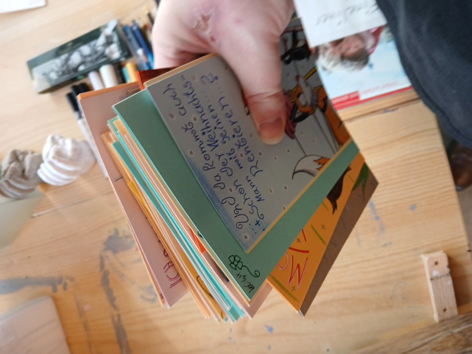 A lot X-mas cards, gift cards, special commissions, "Event" Cards, some woodwork and special samples, all that stuff.