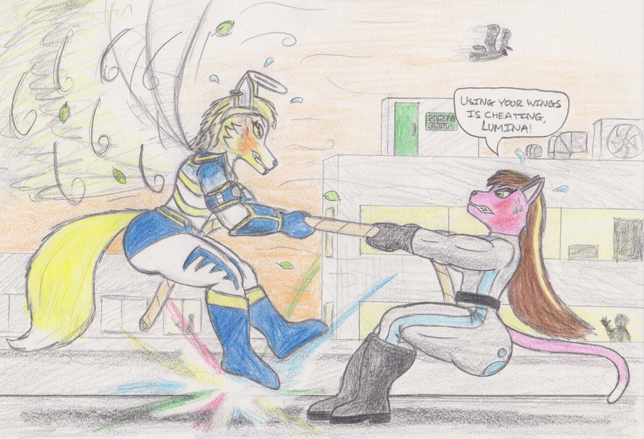 I noted that Lumina had pretty strong looking legs and asked FDF who would win in a tug of war scenario between Sasha and her. Sasha is stronger than the angel who had fallen from grace but Lumina wouldn't entirely get the premise of a tug of war so would use her wings to aid her.