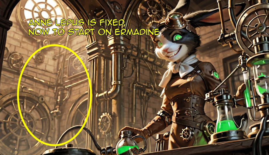 Ermadine A new NPC of mine. She's playing a small role in Cubsitting Simulator v0.3.0, as a crazy apothecary who doesn't ask too many questions about whatever you want to buy from her. Quite high strung, she has rigged her drugstore to blow to kingdom come if the police ever catch on to her MDMA drug empire. I like her design quite a bit, so she may get a sidequest or something in v0.4.0, we'll see.