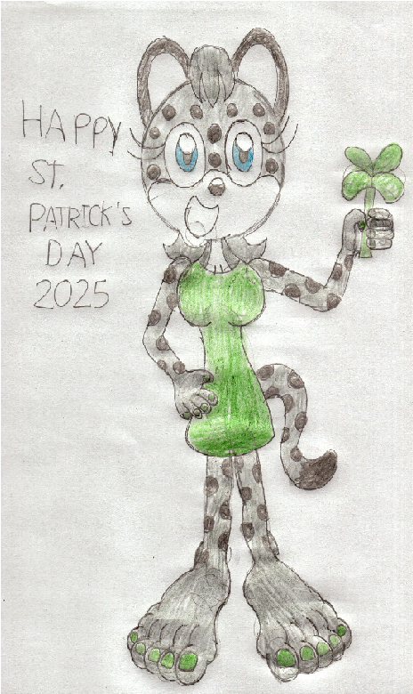 For St. Patrick's Day 2025, I drew my Mobian OC gal Nicole the Snow Leopard wearing a green dress and holding a four leaf clover while she has big feet and green nail polish on her fingernails and toenails.