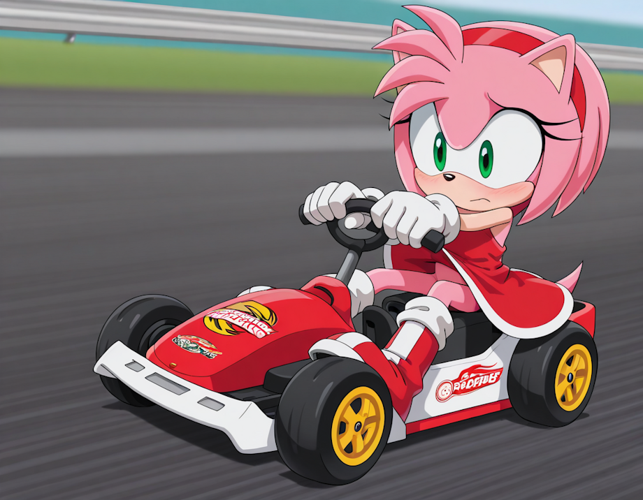 Positive prompt: amy rose racing, go-kart, furry female, child, loli, red boots on pedals, (steering wheel:1.4),