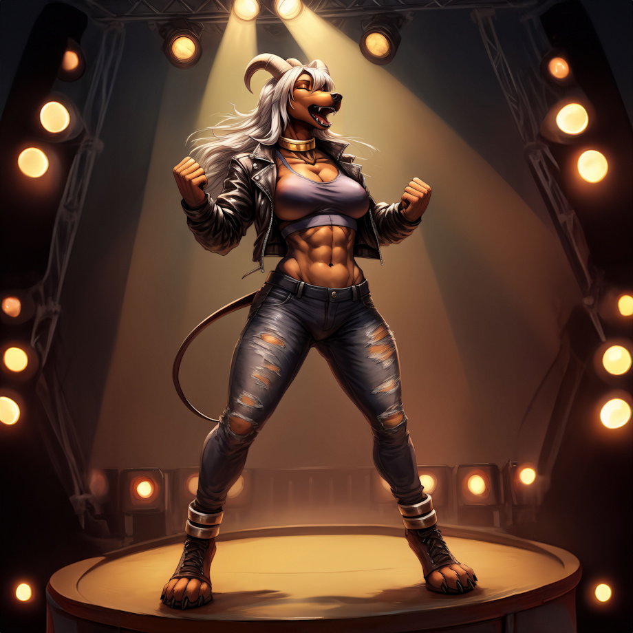 <lora:(1) Furtastic Detailer:1> BREAK (stage lights:1.2) (concert, on stage:1.3) (leather jacket, sports bra:1.3) (ripped jeans:1) (day:1.3) (screaming into a microphone:1.2) (eyes closed:1.2) (fist pump:1.3) (death metal makeup:1.3), BREAK A (mature:1) (female:1) (houndoom:1.3) with a (voluptuous:1), (athletic body:1) with (fangs:1) , (medium breasts, :1) with (:1), (white horns:1), a (forked tail:1) and (red eyes with black pupils:1). She has (long white hair:1.3) with (blunt bangs), and wears a (gold collar:1) (digitigrade:1). Negative prompt: bloodshot eyes, arms behind back, hands behind back, blurry, blurry background, bad anatomy, bad hands, three hands, three legs, bad arms, missing legs, missing arms, poorly drawn face, bad face, fused face, cloned face, worst face, three crus, extra crus, fused crus, worst feet, three feet, fused feet, fused thigh, three thigh, fused thigh, extra thigh, worst thigh, missing fingers, extra fingers, ugly fingers, long fingers, horn, realistic photo, extra eyes, huge eyes, 2girl, amputation, disconnected limbs, worst quality, normal quality, low quality, low res, blurry, text, watermark, logo, banner, extra digits, cropped, jpeg artifacts, signature, username, error, sketch ,duplicate, ugly, monochrome, horror, geometry, mutation, disgusting, jpeg artifacts, bad quality, jpg artifacts,badhandv4, easynegative, multiple tails, disconnected tail, boring_e621_v4, bad quality, worst quality, Steps: 35, Sampler: Euler a, CFG scale: 7, Seed: 725381950, Size: 768x1152, Model hash: 11418ef90f, Model: yiffymix_v43, VAE hash: 24e650297c, VAE: furception_vae_1-0.safetensors, Denoising strength: 0.68, Mask blur: 4, CFG Rescale: 0.7, Lora hashes: "(1) Furtastic Detailer: 2e94914f676c", Version: v1.6.0 |