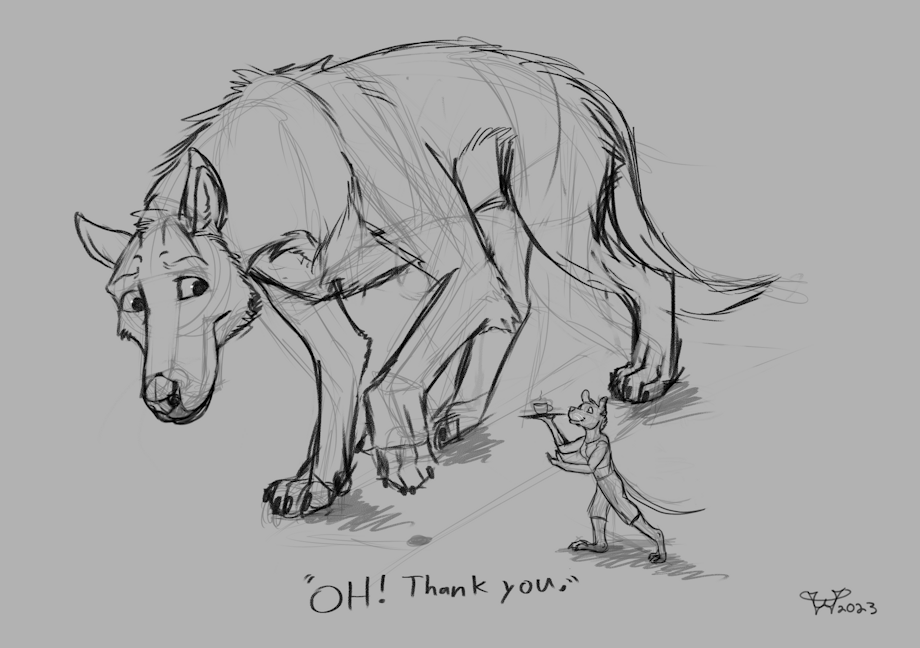 The little waitress is undaunted by her leggy patron! She may have caught the big wolf off guard though.❤️