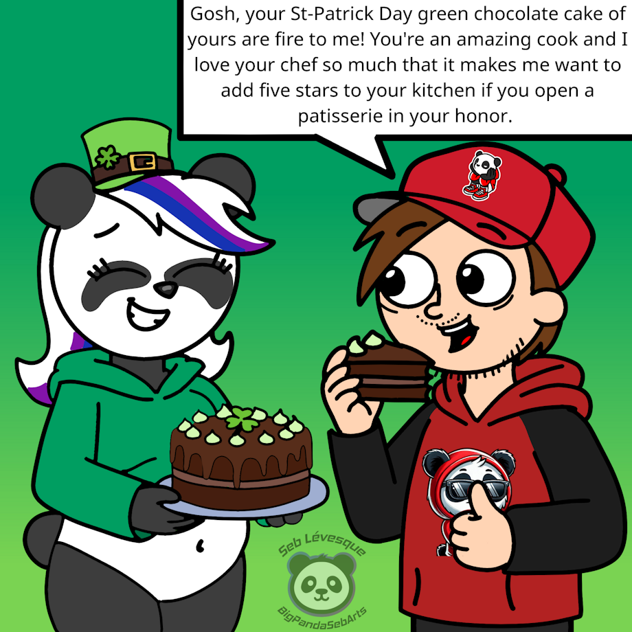 Here's a late drawing about Mr.S (Seb) testing the St-Patrick Day green chocolate cake that his lover Rebecca made for him. The thumb up is a approval, as he's loving it.