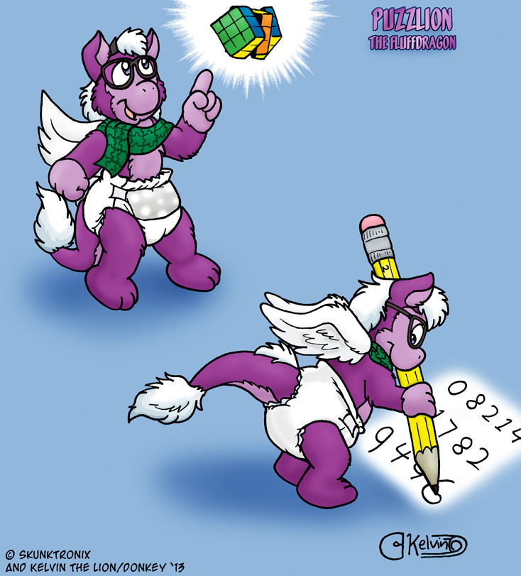 offered to draw mythies for possible inclusion in his comic, I knew I had to get one. I'd always wanted my very own fluffdragon, and here he is, "Puzzlion". I didn't specify a name in my request, but I think this name is pretty good anyway.