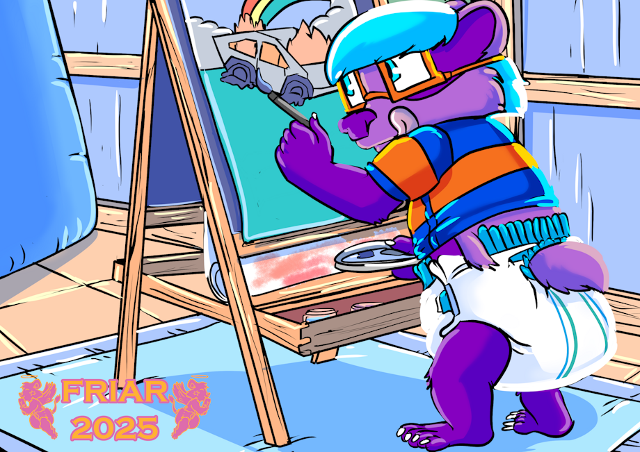 Illustration of Everett the wet and messy diapered badger in the treehouse painting a picture of a Tesla cybertruck on fire while a rainbow lands upon it.