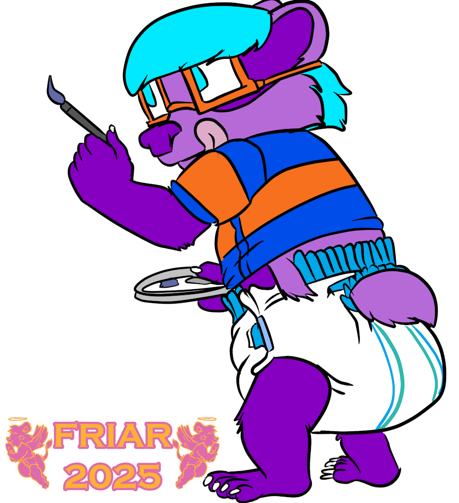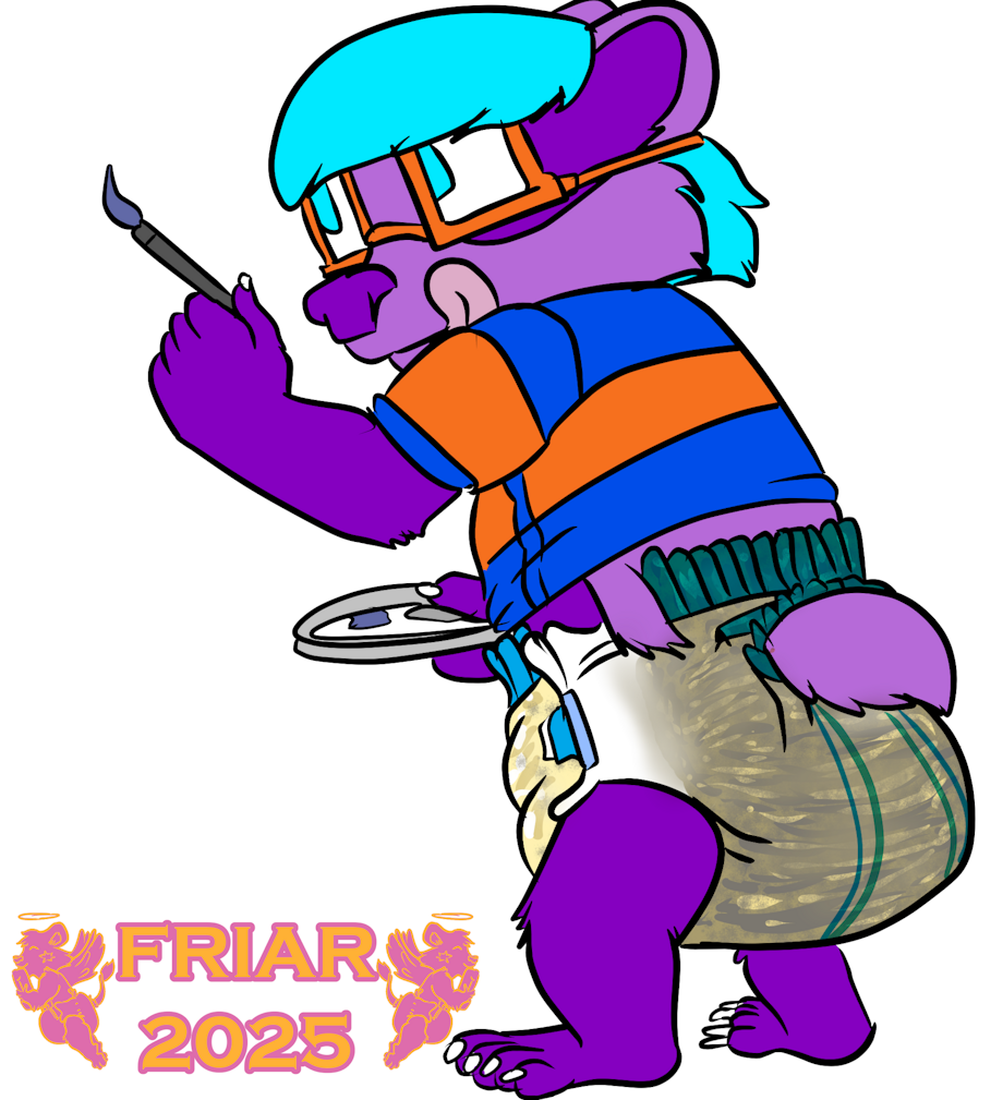 Illustration of Everett the wet and messy diapered badger in the treehouse painting a picture of a Tesla cybertruck on fire while a rainbow lands upon it.