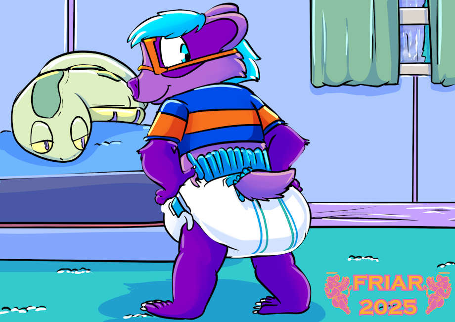 Illustration of Everett the wet and messy diapered badger in his bedroom posing for the viewer from behind with his paws on his hips while his snake plushie looks on from the bed.