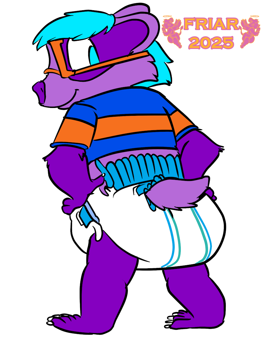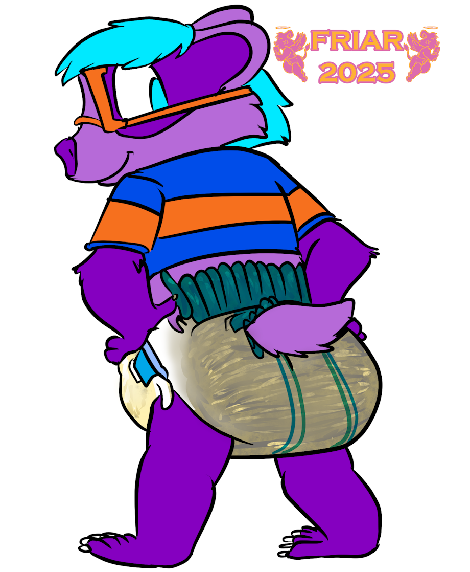 Illustration of Everett the wet and messy diapered badger in his bedroom posing for the viewer from behind with his paws on his hips while his snake plushie looks on from the bed.