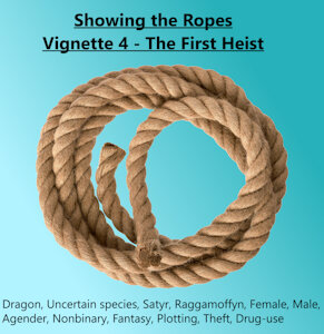 Lazing on piles of rich fabrics, the pair began to recount their caper. Meeritza would point out some thing that Yes had done that she couldn't have managed, and Yes even managed to be complimentary towards her. She asked how the tricks with the ropes and strings were managed, to which Yes would only reply with ``I just can, I'm a dragon.'' They joked and told stories of tricks and conquests and the strange tidbits Meeritza had learned in her urchinery. Finally, they were both too tired to continue as the last candle burned low on its fancy silver stick.