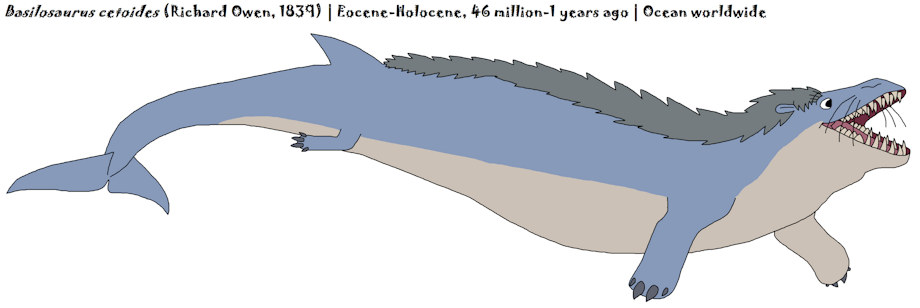 Basilosaurus ("Basilisk reptile") is a genus of prehistoric cetaceans that existed during the Middle Eocene to late Holocene, 46 million to 1 years ago. The first fossil of B. cetoides was discovered in the United States and was initially believed to be some sort of reptile, hence the suffix -saurus, but it was later found to be a marine mammal. Richard Owen wished to rename the creature Zeuglodon ("Yoked Tooth"), but, per taxonomic rules, the creature's first name remained permanent. Fossils of Basilosaurus isis have been found in Egypt and Jordan.
