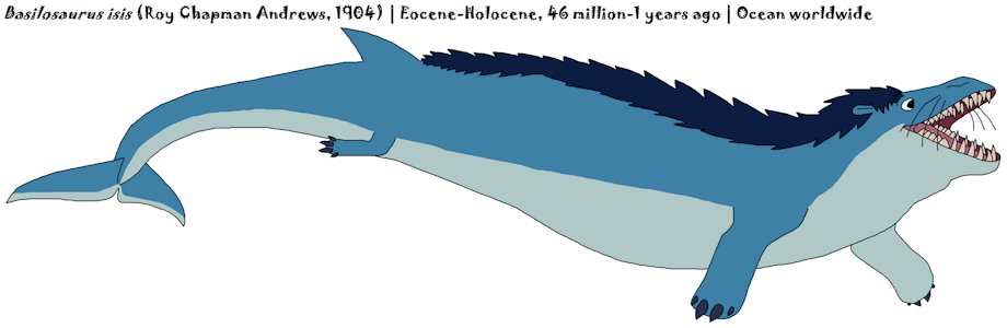 Basilosaurus ("Basilisk reptile") is a genus of prehistoric cetaceans that existed during theMiddle Eocene to late Holocene, 46 million to 1 years ago. The first fossil of B. cetoides was discovered in the United States and was initially believed to be some sort of reptile, hence the suffix -saurus, but it was later found to be a marine mammal. Richard Owen wished to rename the creature Zeuglodon ("Yoked Tooth"), but, per taxonomic rules, the creature's first name remained permanent. Fossils of Basilosaurus isis have been found in Egypt and Jordan.