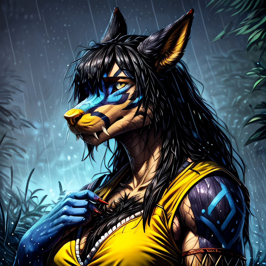 masterpiece, best quality <lora:(1) Furtastic Detailer:1> (tribal outfit:1.4) BREAK <f1ick3r> A (mightyena:1.3) (female:1.2) (medium breasts:1.4) (white markings:1.3) (tribal markings:1.3) with (fluffy body:1.3). She has (long hair:1.3) (ponytail:1.3) (white hair:1.5) (long bangs:1.4) (red fur:1.5) (athletic:1.4) (blue eyes with small pupils:1.5) and and (white belly:1.4) (scuted arms:1.4) (scuted legs:1.4) (bird:legs:1.5) (white shins:1.4) (talons:1.4) (bird's talons, long nails:1.4) <lora:CharacterDesign_Concept:0.6> (CharacterSheet:1), (multiple views, full body, upper body, reference sheet:1), Negative prompt: bloodshot eyes, arms behind back, hands behind back, blurry, blurry background, bad anatomy, bad hands, three hands, three legs, bad arms, missing legs, missing arms, poorly drawn face, bad face, fused face, cloned face, worst face, three crus, extra crus, fused crus, worst feet, three feet, fused feet, fused thigh, three thigh, fused thigh, extra thigh, worst thigh, missing fingers, extra fingers, ugly fingers, long fingers, horn, realistic photo, extra eyes, huge eyes, 2girl, amputation, disconnected limbs, worst quality, normal quality, low quality, low res, blurry, text, watermark, logo, banner, extra digits, cropped, jpeg artifacts, signature, username, error, sketch ,duplicate, ugly, monochrome, horror, geometry, mutation, disgusting, jpeg artifacts, bad quality, jpg artifacts,badhandv4, easynegative boring_e621_v4, bad quality, worst quality Steps: 35, Sampler: Euler, CFG scale: 7, Seed: 909130280, Size: 768x1152, Model hash: 8e2f4f1346, Model: yiffymix_v44, VAE hash: 24e650297c, VAE: furception_vae_1-0.safetensors, Denoising strength: 0.55, Mask blur: 4, CFG Rescale: 0.7, Lora hashes: "(1) Furtastic Detailer: 2e94914f676c, CharacterDesign_Concept: 6f65857a23ad", Version: v1.6.0 |