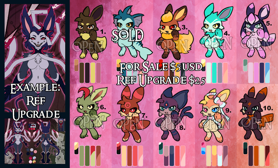 1. Eevee - OPEN 2. Vaporeon - SOLD radevours 3. Flareon - OPEN 4. Jolteon - OPEN 5. Glaceon - OPEN 6. Leafeon - OPEN 7. Umbreon - OPEN 8. Espeon - OPEN 9. Sylveon - OPEN 10. Pikachu - OPEN