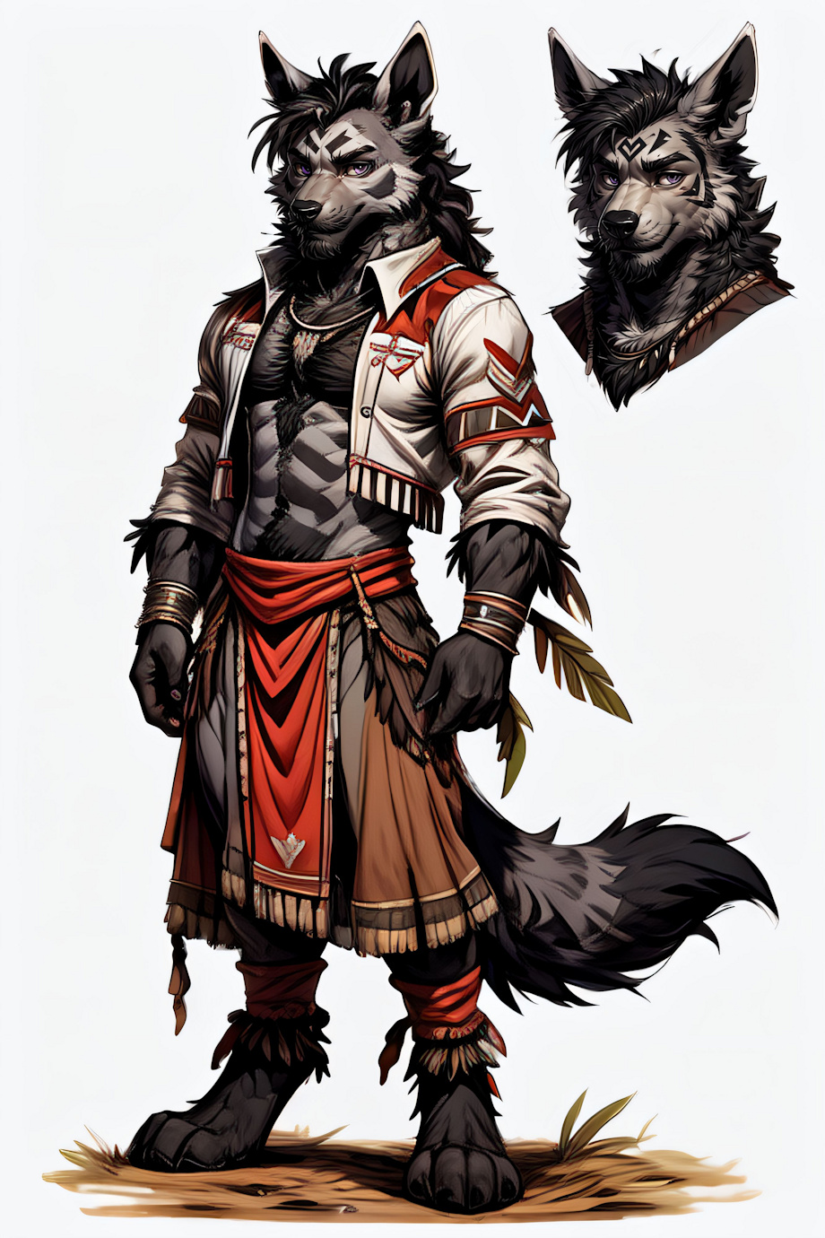 6'5", Long Limbs, Agile Build, White Fur with Black Markings, Black Forearms, Digitigrade Legs, Clawed Fingers, Toe Claws, and Pointed Ears.