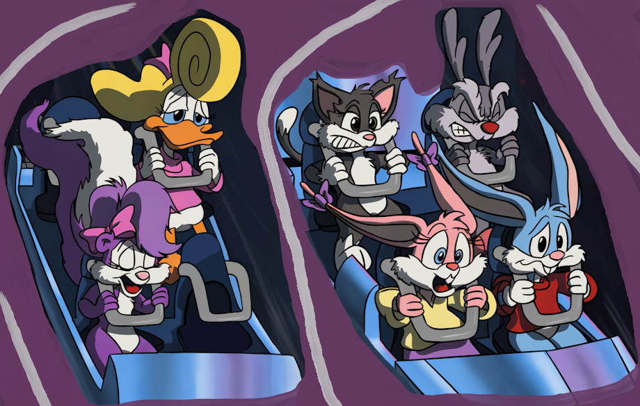 An Edit Of A Commission Made By Kumata of The Tiny Toons' Buster Bunny, Babs Bunny, Fifi La Fume, Calamity Coyote, & Shirley The Loon (and Rita The Cat from Animaniacs) Riding The Rock n' Roller Coaster!