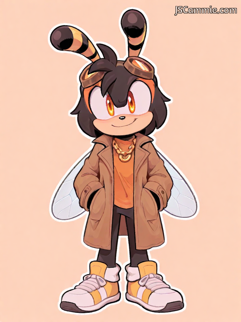 Prompt: Art By Toonsite, masterpiece, best quality, amazing quality, very aesthetic, 1boy, solo, sonic (series), furry, male, charmy bee, black hair, aged up, smiling at viewer, orange eyes, orange shirt, brown winter coat, sneakers, goggles, gold chain necklace, insect wings,
