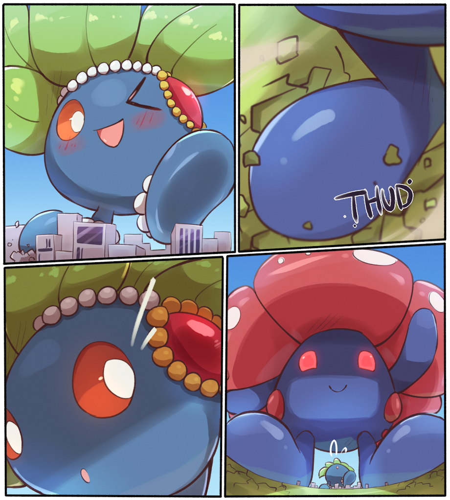 Pead is having some fun stomping over city and kicking tiny city building! But it seem like a bigger plant showed up~