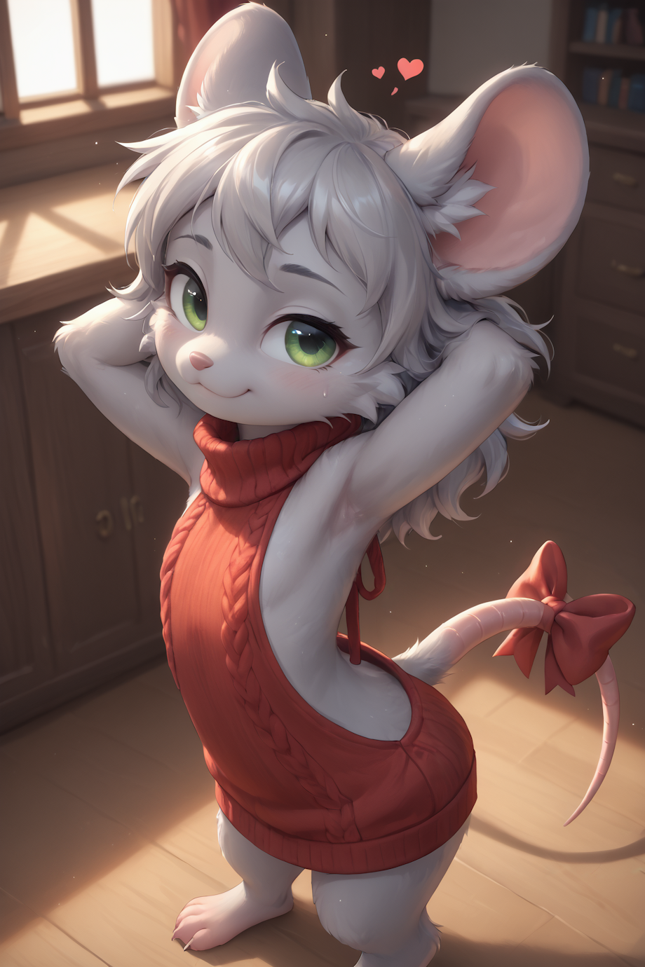 green eyes,grey fur,grey hair,medium hair,wavy hair,kind smile,cute smile,cute eyes,large red bow on mouse tail,mouse tail,
