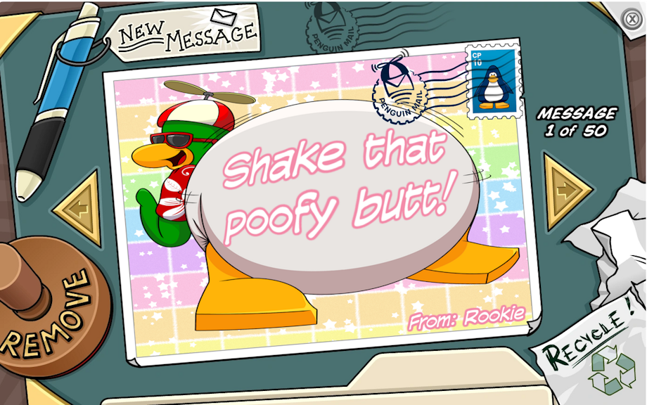 Rookie decided it would be a good idea to mail these postcards to every penguin he meant. Least he's having fun shaking his poofy booty! Maybe you can send a postcard back as a thank you?