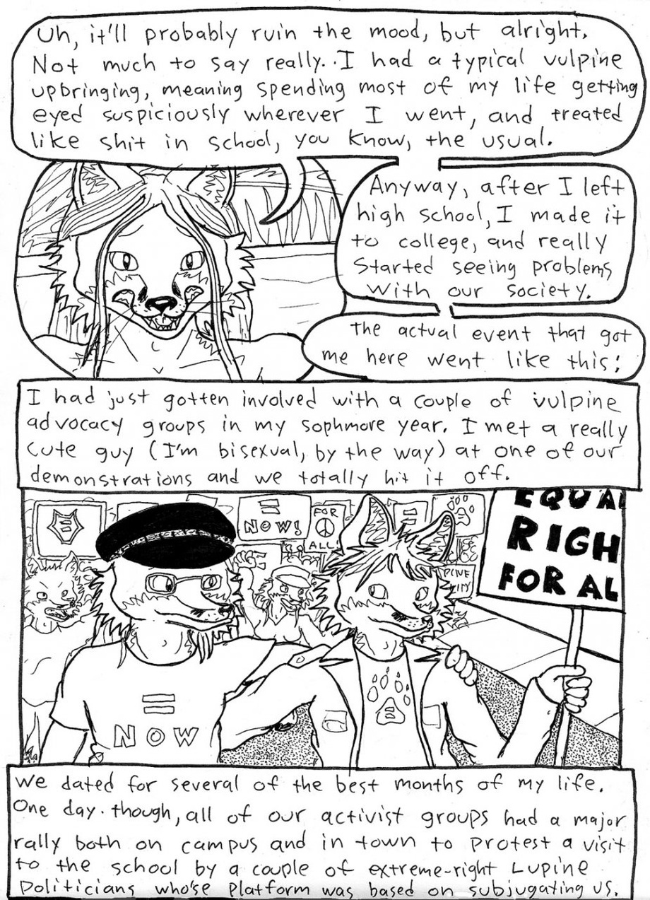 This is a comic I started back in 2010 that has become massive. It's about a group of revolutionary red foxes, the Vulpine Liberation Front (VLF), and their plot to trap a couple of problem cops into a forceful, sex-and-drugs based "social rehabilitation" program run by the group.