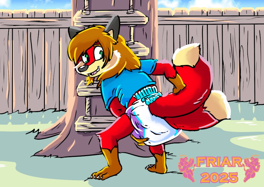 Illustration of Ozzy the wet and messy diapered two tailed fox squishing his diaper and holding one of his tails while he smiles at the viewer with the treehouse ladder in the background.