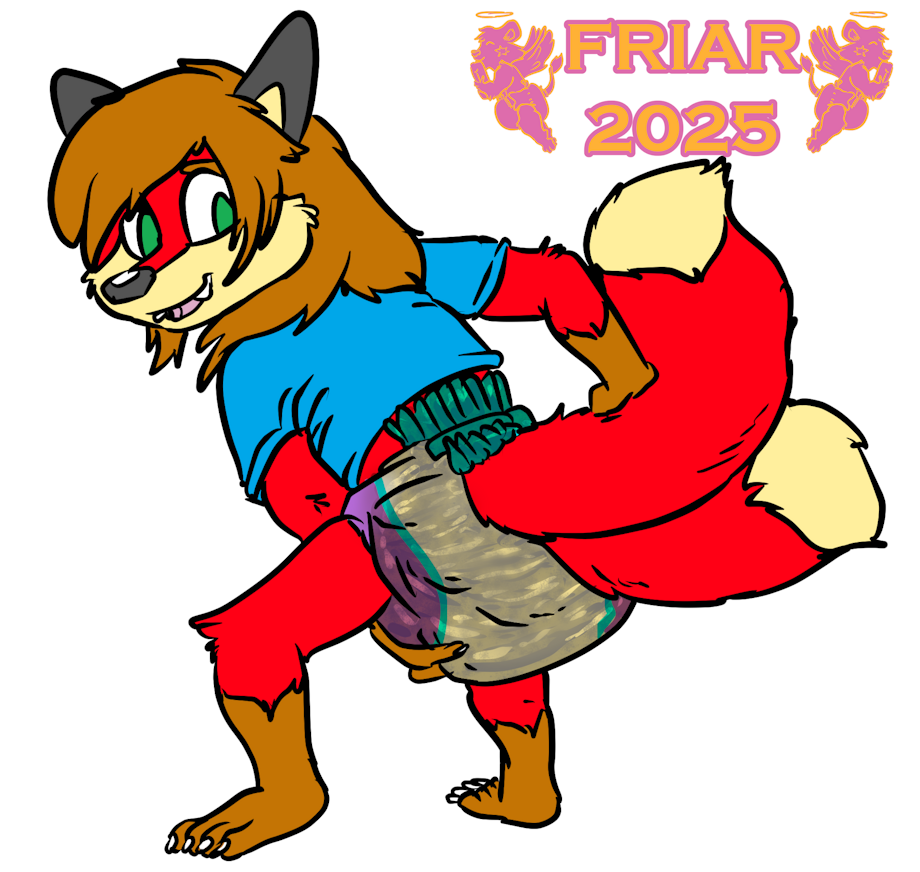 Illustration of Ozzy the wet and messy diapered two tailed fox squishing his diaper and holding one of his tails while he smiles at the viewer with the treehouse ladder in the background.