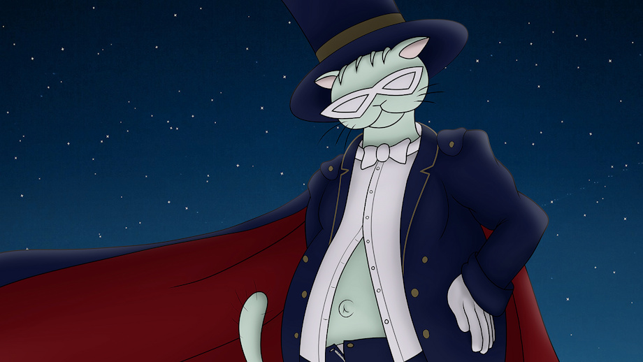 This big fat cat saved Luna (the female talking cat of the show) from a bunch of street cats, and doing so in a fashion similar to the way Tuxedo Mask saves Sailor Moon (except that Rhett threw a fish-bone instead of a rose). The whole episode was great, and I originally wanted to draw Bakene, the demonic form that Rhett gets turned into, but ultimately as I failed at capturing him on paper, I decided to instead draw Rhett as an anthro, in a Tuxedo Mask outfit, being really fat... just cause I found it funny! https://youtu.be/2QeRP75316o?si=EtGMjQFLI8akw6Rb&t=32