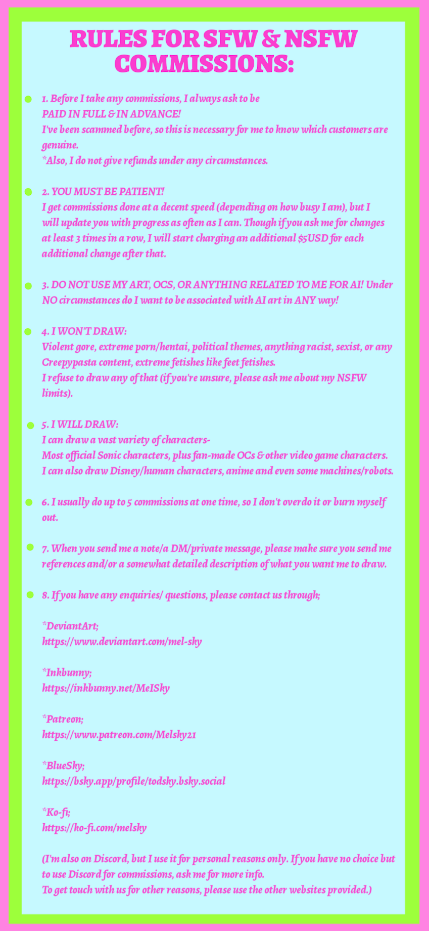*DeviantArt; www.deviantart.com/mel-sky *Inkbunny; inkbunny.net/MelSky *Discord; (For Personal Use Only) *Tumblr; www.tumblr.com/melskytodstar *BlueSky; https://bsky.app/profile/todsky.bsky.social *Patreon; www.patreon.com/MelSky21