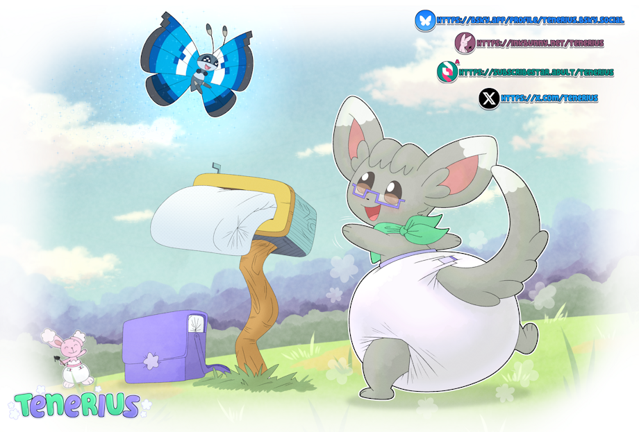 Gentle Poofy Reminder you can find me on other platforms!~ This image is mostly intended for my audience on Twitter and as a shameless self plug, but I like how it came out! I included a version of the pic without the logos and stuff too! ;><