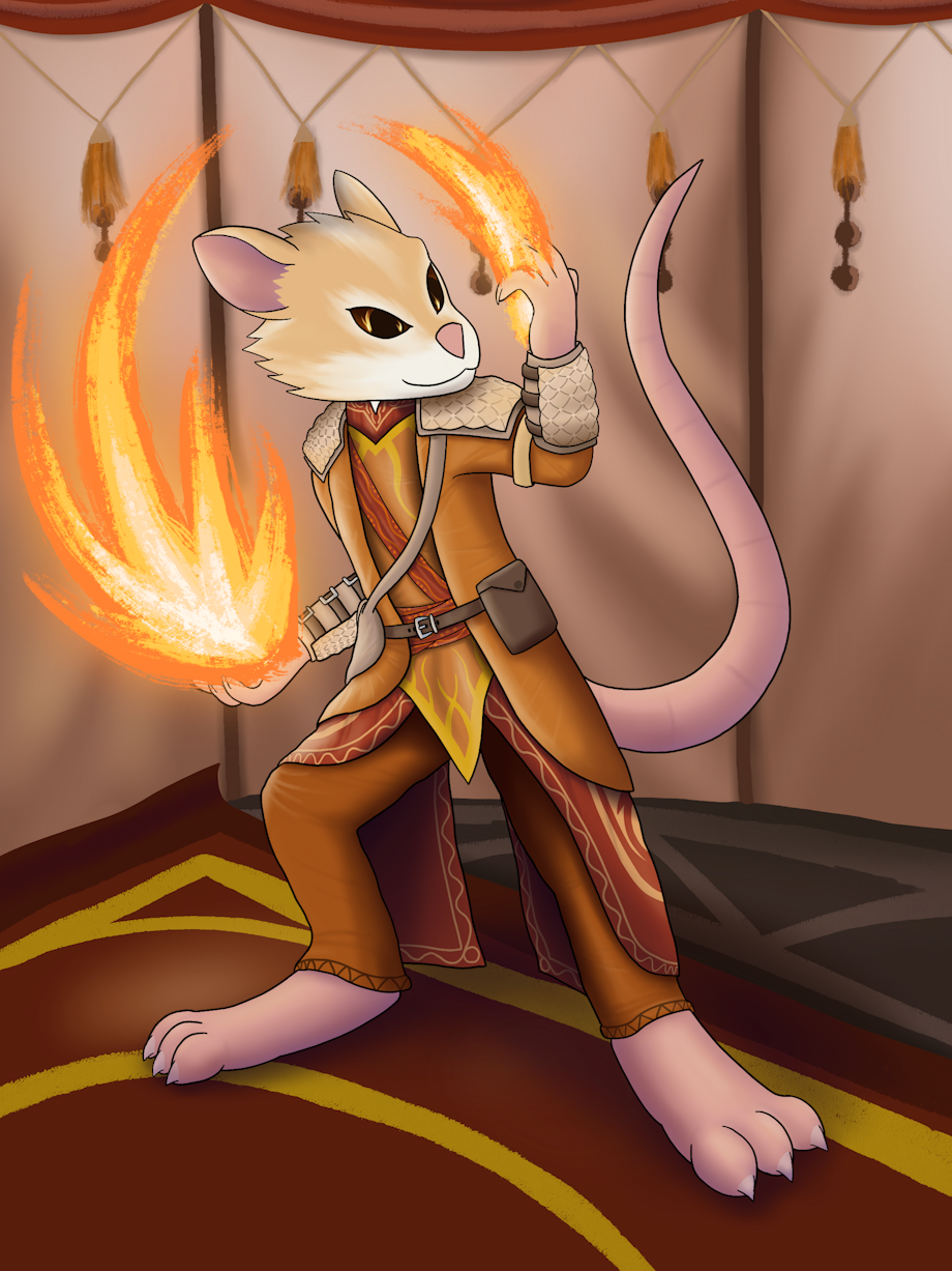 When Tavich was a young child, her family was attacked by a nomadic marauder cult of Nurgal, the demon lord of sunlight and war. The cult slaughtered her family and took her along with their treasure. They planned to sacrifice her, but when they did, Tavich returned to life and was gifted power over fire.