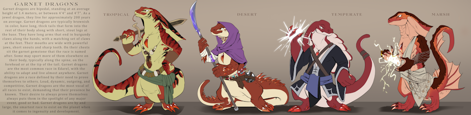 Garnet dragons are the most common race in Edarel, with the ability to adapt and live almost anywhere. Housing towns along the fertile grasslands of Charir, Garnet dragons are a race defined by their need to prove themselves to others. Loud, dynamic, outgoing and competitive, Garnet dragons are the most vocal of all races to exist, demanding that their presence be known and to never look down on them. Determination fueled by the devastating loss from years past, their desire to always prove themselves always puts them in the spotlight of any major events, good or bad. This fervent nature brings ire to other races who are more reserved such as Amber and Pearl dragons, while also being a point of intense friction with the overly controlling Kethana. Emerald dragons however tend to prefer this attitude, rarely looking down upon the race. Thanks to this, the Garnet dragons live comfortably as a race in mid standing across the world.