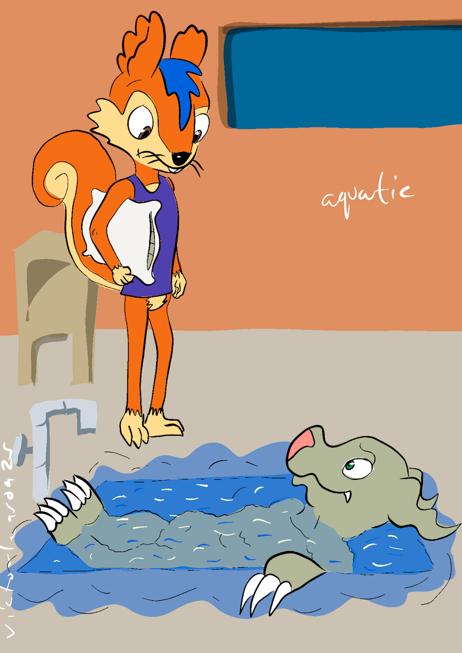 #Aptoapril 14: aquatic. Sheryl the monster invites Victor the squirrel to a sleepover. They mention him they has a waterbed, turns out is a hole filled up with water.