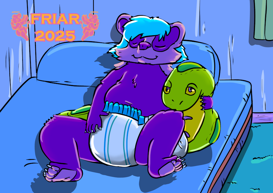 Illustration of Everett the wet and messy diapered badger squishing his diaper while flopped against his snake plushie in bed.