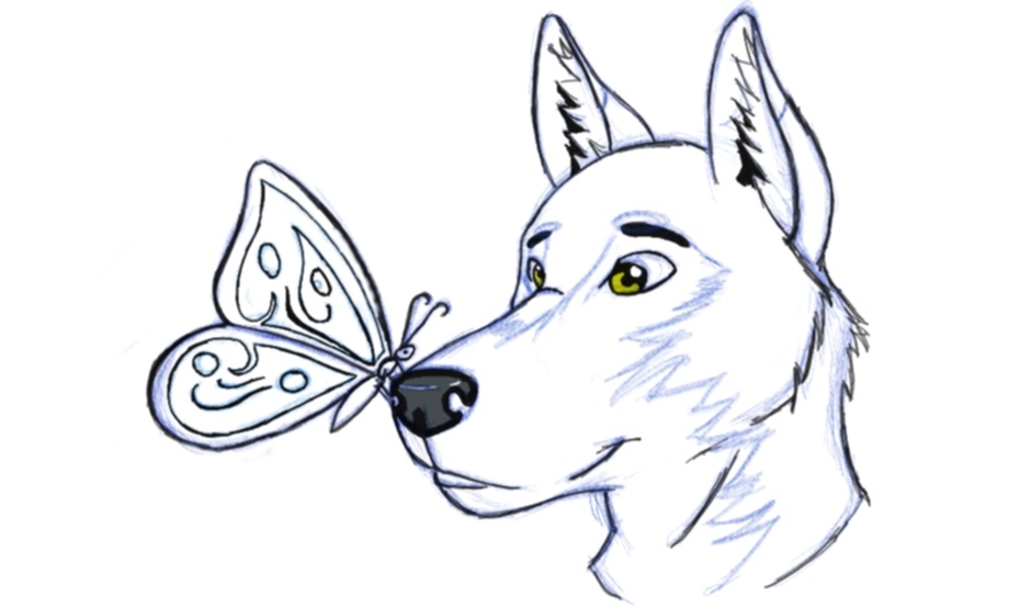 well this is my first posting. its of a dog with a butterfly sitting pretty on his nose