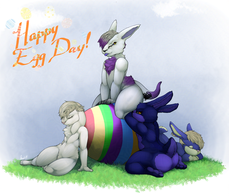Featuring faces both new and old; • Kunie the Hybrid seated victoriously ontop of the egg, • Bon Nigels sulking next to the egg after having been given a lipstick smooch from Kunie (he has to cover it up so it isn't seen), • Kanin napping against the egg after much egg painting, • Erik Fluffybuns sleeping behind the egg, exhausted from socializing, and made even sleepier from bunny cuddles
