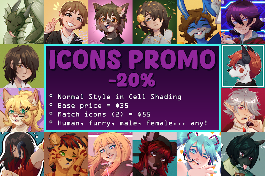 ✦ DETAILS ✦ ✧ Normal Style / Cell Shading / Icon ✧ Transparent, Flat Color or Simple Background ✧ Any gender / Species ✧ Send a Note / DM / Email with the tittle "Icons Promo" please! ✧ Promo via VGen