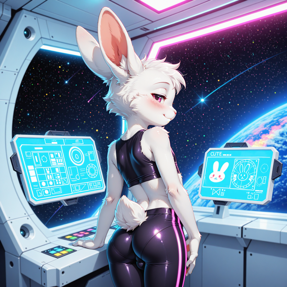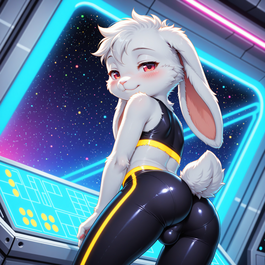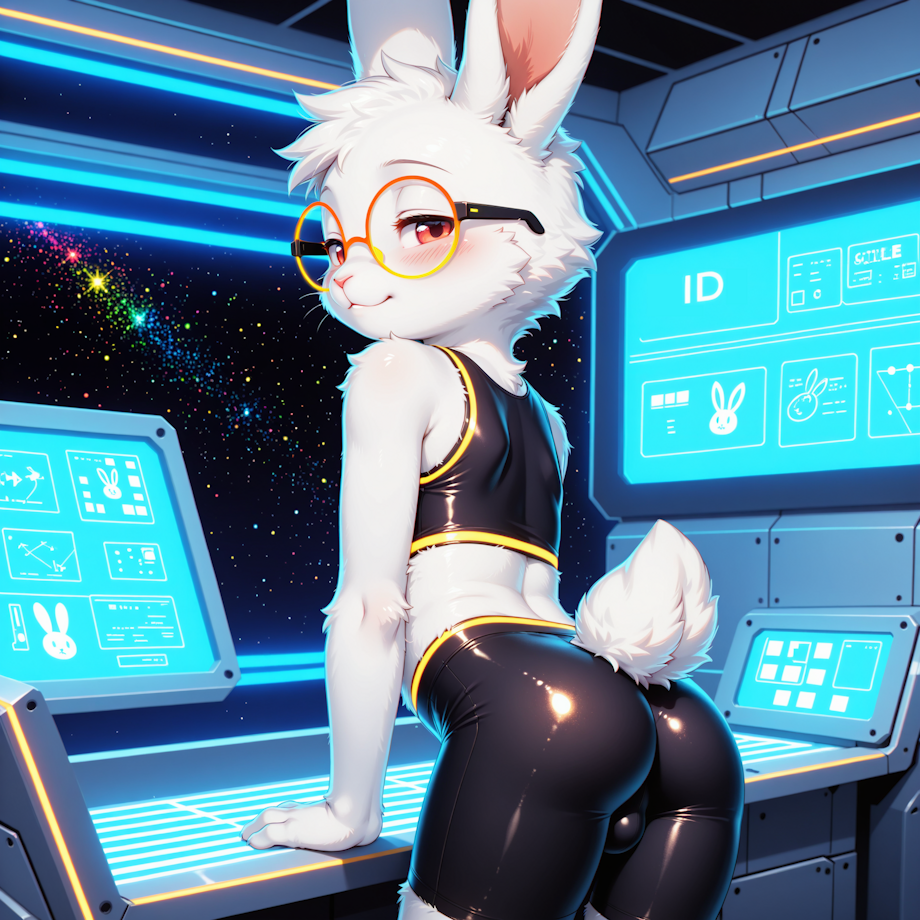 Prompt: (masterpiece, best quality, rabbit, male:1.3), solo, furry, young, nude, fluffy, white fur, blush, bulge, spandex crop top, detailed background, cute pose, neon background, vivid colors, cute face, adorable, confident expression, half-closed eyes, small cute butt, in space station, control panels, solo, colorful lighting